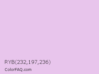 RYB 232,197,236 Color is a very light magenta color and the nearest color is French Lilac #ecc7ee. Hex code #e8c5ec and RGB value is rgb(232,197,236). In RGB color space, this color is composed of 91% red, 77% green, 93% blue, In CMYK color space, this color is composed of 2% cyan, 17% magenta, 0% yellow , 7% black , In HSL color space, this color has a hue angle of 294° , 51% saturation and 85% lightness.