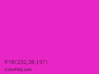 RYB 232,38,197 Color is a normal magenta color and the nearest color is Hot Magenta #ff1dce. Hex code #e826c5 and RGB value is rgb(232,38,197). In RGB color space, this color is composed of 91% red, 15% green, 77% blue, In CMYK color space, this color is composed of 0% cyan, 84% magenta, 15% yellow , 9% black , In HSL color space, this color has a hue angle of 311° , 81% saturation and 53% lightness.