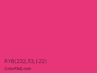 RYB 232,53,122 Color is a normal rose color and the nearest color is Cerise Pink #ec3b83. Hex code #e8357a and RGB value is rgb(232,53,122). In RGB color space, this color is composed of 91% red, 21% green, 48% blue, In CMYK color space, this color is composed of 0% cyan, 77% magenta, 47% yellow , 9% black , In HSL color space, this color has a hue angle of 337° , 80% saturation and 56% lightness.
