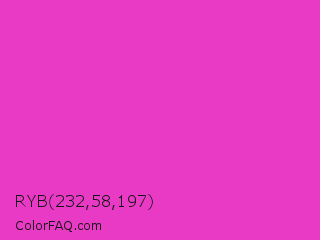 RYB 232,58,197 Color is a normal magenta color and the nearest color is Razzle Dazzle Rose #ff33cc. Hex code #e83ac5 and RGB value is rgb(232,58,197). In RGB color space, this color is composed of 91% red, 23% green, 77% blue, In CMYK color space, this color is composed of 0% cyan, 75% magenta, 15% yellow , 9% black , In HSL color space, this color has a hue angle of 312° , 79% saturation and 57% lightness.