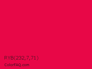 RYB 232,7,71 Color is a normal rose color and the nearest color is Red Ribbon #ed0a3f. Hex code #e80747 and RGB value is rgb(232,7,71). In RGB color space, this color is composed of 91% red, 3% green, 28% blue, In CMYK color space, this color is composed of 0% cyan, 97% magenta, 69% yellow , 9% black , In HSL color space, this color has a hue angle of 343° , 94% saturation and 47% lightness.