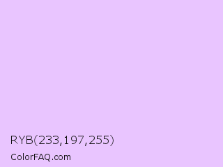 RYB 233,197,255 Color is a very light purple color and the nearest color is Electric Lavender #f4bbff. Hex code #e9c5ff and RGB value is rgb(233,197,255). In RGB color space, this color is composed of 91% red, 77% green, 100% blue, In CMYK color space, this color is composed of 9% cyan, 23% magenta, 0% yellow , 0% black , In HSL color space, this color has a hue angle of 277° , 100% saturation and 89% lightness.