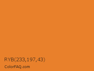 RYB 233,197,43 Color is a normal orange color and the nearest color is Cadmium Orange #ed872d. Hex code #e9802b and RGB value is rgb(233,128,43). In RGB color space, this color is composed of 91% red, 50% green, 17% blue, In CMYK color space, this color is composed of 0% cyan, 45% magenta, 82% yellow , 9% black , In HSL color space, this color has a hue angle of 27° , 81% saturation and 54% lightness.