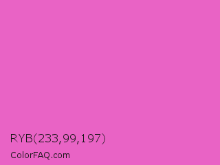 RYB 233,99,197 Color is a light magenta color and the nearest color is Rose Pink #ff66cc. Hex code #e963c5 and RGB value is rgb(233,99,197). In RGB color space, this color is composed of 91% red, 39% green, 77% blue, In CMYK color space, this color is composed of 0% cyan, 58% magenta, 15% yellow , 9% black , In HSL color space, this color has a hue angle of 316° , 75% saturation and 65% lightness.