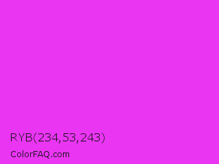 RYB 234,53,243 Color is a normal magenta color and the nearest color is Purple Pizzazz #fe4eda. Hex code #ea35f3 and RGB value is rgb(234,53,243). In RGB color space, this color is composed of 92% red, 21% green, 95% blue, In CMYK color space, this color is composed of 4% cyan, 78% magenta, 0% yellow , 5% black , In HSL color space, this color has a hue angle of 297° , 89% saturation and 58% lightness.