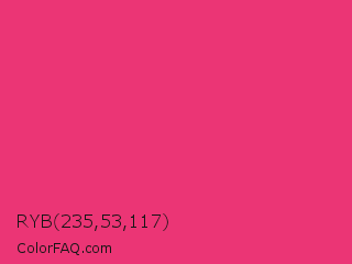 RYB 235,53,117 Color is a normal rose color and the nearest color is Cerise Pink #ec3b83. Hex code #eb3575 and RGB value is rgb(235,53,117). In RGB color space, this color is composed of 92% red, 21% green, 46% blue, In CMYK color space, this color is composed of 0% cyan, 77% magenta, 50% yellow , 8% black , In HSL color space, this color has a hue angle of 339° , 82% saturation and 56% lightness.