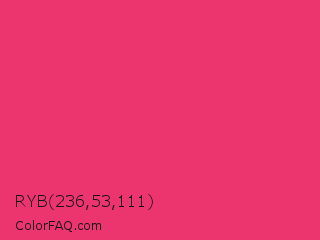 RYB 236,53,111 Color is a normal rose color and the nearest color is Paradise Pink #e63e62. Hex code #ec356f and RGB value is rgb(236,53,111). In RGB color space, this color is composed of 93% red, 21% green, 44% blue, In CMYK color space, this color is composed of 0% cyan, 78% magenta, 53% yellow , 7% black , In HSL color space, this color has a hue angle of 341° , 83% saturation and 57% lightness.