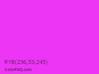 RYB 236,53,245 Color is a normal magenta color and the nearest color is Purple Pizzazz #fe4eda. Hex code #ec35f5 and RGB value is rgb(236,53,245). In RGB color space, this color is composed of 93% red, 21% green, 96% blue, In CMYK color space, this color is composed of 4% cyan, 78% magenta, 0% yellow , 4% black , In HSL color space, this color has a hue angle of 297° , 91% saturation and 58% lightness.