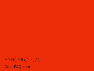 RYB 236,53,7 Color is a normal red color and the nearest color is Ferrari Red #ff2800. Hex code #ec2d07 and RGB value is rgb(236,45,7). In RGB color space, this color is composed of 93% red, 18% green, 3% blue, In CMYK color space, this color is composed of 0% cyan, 81% magenta, 97% yellow , 7% black , In HSL color space, this color has a hue angle of 10° , 94% saturation and 48% lightness.