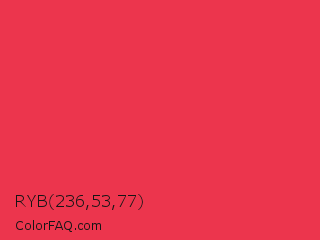 RYB 236,53,77 Color is a normal red color and the nearest color is Desire #ea3c53. Hex code #ec354d and RGB value is rgb(236,53,77). In RGB color space, this color is composed of 93% red, 21% green, 30% blue, In CMYK color space, this color is composed of 0% cyan, 78% magenta, 67% yellow , 7% black , In HSL color space, this color has a hue angle of 352° , 83% saturation and 57% lightness.