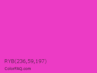 RYB 236,59,197 Color is a normal magenta color and the nearest color is Razzle Dazzle Rose #ff33cc. Hex code #ec3bc5 and RGB value is rgb(236,59,197). In RGB color space, this color is composed of 93% red, 23% green, 77% blue, In CMYK color space, this color is composed of 0% cyan, 75% magenta, 17% yellow , 7% black , In HSL color space, this color has a hue angle of 313° , 82% saturation and 58% lightness.
