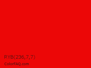 RYB 236,7,7 Color is a normal red color and the nearest color is KU Crimson #e8000d. Hex code #ec0707 and RGB value is rgb(236,7,7). In RGB color space, this color is composed of 93% red, 3% green, 3% blue, In CMYK color space, this color is composed of 0% cyan, 97% magenta, 97% yellow , 7% black , In HSL color space, this color has a hue angle of 0° , 94% saturation and 48% lightness.