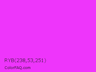 RYB 238,53,251 Color is a normal magenta color and the nearest color is Purple Pizzazz #fe4eda. Hex code #ee35fb and RGB value is rgb(238,53,251). In RGB color space, this color is composed of 93% red, 21% green, 98% blue, In CMYK color space, this color is composed of 5% cyan, 79% magenta, 0% yellow , 2% black , In HSL color space, this color has a hue angle of 296° , 96% saturation and 60% lightness.
