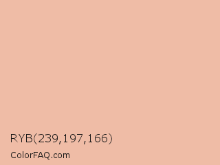 RYB 239,197,166 Color is a light orange color and the nearest color is Cashmere #e6bea5. Hex code #efbca6 and RGB value is rgb(239,188,166). In RGB color space, this color is composed of 94% red, 74% green, 65% blue, In CMYK color space, this color is composed of 0% cyan, 21% magenta, 31% yellow , 6% black , In HSL color space, this color has a hue angle of 18° , 70% saturation and 79% lightness.