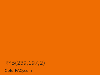 RYB 239,197,2 Color is a normal orange color and the nearest color is Clementine #e96e00. Hex code #ef6d02 and RGB value is rgb(239,109,2). In RGB color space, this color is composed of 94% red, 43% green, 1% blue, In CMYK color space, this color is composed of 0% cyan, 54% magenta, 99% yellow , 6% black , In HSL color space, this color has a hue angle of 27° , 98% saturation and 47% lightness.