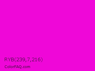 RYB 239,7,216 Color is a normal magenta color and the nearest color is Purple Pizzazz #ff00cc. Hex code #ef07d8 and RGB value is rgb(239,7,216). In RGB color space, this color is composed of 94% red, 3% green, 85% blue, In CMYK color space, this color is composed of 0% cyan, 97% magenta, 10% yellow , 6% black , In HSL color space, this color has a hue angle of 306° , 94% saturation and 48% lightness.