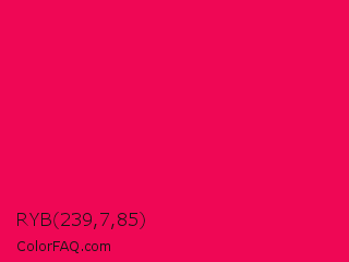 RYB 239,7,85 Color is a normal rose color and the nearest color is Razzmatazz Crayola #e30b5c. Hex code #ef0755 and RGB value is rgb(239,7,85). In RGB color space, this color is composed of 94% red, 3% green, 33% blue, In CMYK color space, this color is composed of 0% cyan, 97% magenta, 64% yellow , 6% black , In HSL color space, this color has a hue angle of 340° , 94% saturation and 48% lightness.