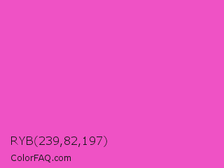 RYB 239,82,197 Color is a light magenta color and the nearest color is Light Deep Pink #ff5ccd. Hex code #ef52c5 and RGB value is rgb(239,82,197). In RGB color space, this color is composed of 94% red, 32% green, 77% blue, In CMYK color space, this color is composed of 0% cyan, 66% magenta, 18% yellow , 6% black , In HSL color space, this color has a hue angle of 316° , 83% saturation and 63% lightness.