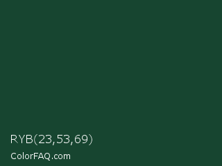 RYB 23,53,69 Color is a very dark green color and the nearest color is Everglade #1c402e. Hex code #174530 and RGB value is rgb(23,69,48). In RGB color space, this color is composed of 9% red, 27% green, 19% blue, In CMYK color space, this color is composed of 67% cyan, 0% magenta, 30% yellow , 73% black , In HSL color space, this color has a hue angle of 153° , 50% saturation and 18% lightness.