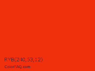 RYB 240,53,12 Color is a normal red color and the nearest color is Red RYB #fe2712. Hex code #f02f0c and RGB value is rgb(240,47,12). In RGB color space, this color is composed of 94% red, 18% green, 5% blue, In CMYK color space, this color is composed of 0% cyan, 80% magenta, 95% yellow , 6% black , In HSL color space, this color has a hue angle of 9° , 90% saturation and 49% lightness.