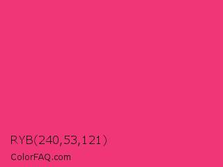 RYB 240,53,121 Color is a normal rose color and the nearest color is Cerise Pink #ec3b83. Hex code #f03579 and RGB value is rgb(240,53,121). In RGB color space, this color is composed of 94% red, 21% green, 47% blue, In CMYK color space, this color is composed of 0% cyan, 78% magenta, 50% yellow , 6% black , In HSL color space, this color has a hue angle of 338° , 86% saturation and 57% lightness.