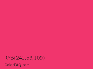 RYB 241,53,109 Color is a normal rose color and the nearest color is Paradise Pink #e63e62. Hex code #f1356d and RGB value is rgb(241,53,109). In RGB color space, this color is composed of 95% red, 21% green, 43% blue, In CMYK color space, this color is composed of 0% cyan, 78% magenta, 55% yellow , 5% black , In HSL color space, this color has a hue angle of 342° , 87% saturation and 58% lightness.