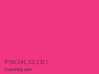 RYB 241,53,131 Color is a normal rose color and the nearest color is Cerise Pink #ec3b83. Hex code #f13583 and RGB value is rgb(241,53,131). In RGB color space, this color is composed of 95% red, 21% green, 51% blue, In CMYK color space, this color is composed of 0% cyan, 78% magenta, 46% yellow , 5% black , In HSL color space, this color has a hue angle of 335° , 87% saturation and 58% lightness.