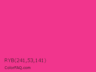 RYB 241,53,141 Color is a normal rose color and the nearest color is Cerise Pink #ec3b83. Hex code #f1358d and RGB value is rgb(241,53,141). In RGB color space, this color is composed of 95% red, 21% green, 55% blue, In CMYK color space, this color is composed of 0% cyan, 78% magenta, 41% yellow , 5% black , In HSL color space, this color has a hue angle of 332° , 87% saturation and 58% lightness.