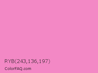 RYB 243,136,197 Color is a light magenta color and the nearest color is Persian Pink #f77fbe. Hex code #f388c5 and RGB value is rgb(243,136,197). In RGB color space, this color is composed of 95% red, 53% green, 77% blue, In CMYK color space, this color is composed of 0% cyan, 44% magenta, 19% yellow , 5% black , In HSL color space, this color has a hue angle of 326° , 82% saturation and 74% lightness.