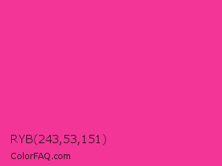 RYB 243,53,151 Color is a normal rose color and the nearest color is Wild Strawberry Crayola #ff3399. Hex code #f33597 and RGB value is rgb(243,53,151). In RGB color space, this color is composed of 95% red, 21% green, 59% blue, In CMYK color space, this color is composed of 0% cyan, 78% magenta, 38% yellow , 5% black , In HSL color space, this color has a hue angle of 329° , 89% saturation and 58% lightness.