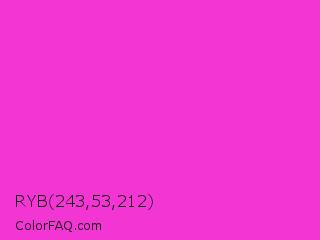 RYB 243,53,212 Color is a normal magenta color and the nearest color is Razzle Dazzle Rose #ff33cc. Hex code #f335d4 and RGB value is rgb(243,53,212). In RGB color space, this color is composed of 95% red, 21% green, 83% blue, In CMYK color space, this color is composed of 0% cyan, 78% magenta, 13% yellow , 5% black , In HSL color space, this color has a hue angle of 310° , 89% saturation and 58% lightness.