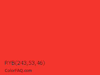 RYB 243,53,46 Color is a normal red color and the nearest color is Deep Carmine Pink #ef3038. Hex code #f3352e and RGB value is rgb(243,53,46). In RGB color space, this color is composed of 95% red, 21% green, 18% blue, In CMYK color space, this color is composed of 0% cyan, 78% magenta, 81% yellow , 5% black , In HSL color space, this color has a hue angle of 2° , 89% saturation and 57% lightness.
