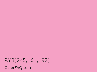 RYB 245,161,197 Color is a light rose color and the nearest color is Illusion #f6a4c9. Hex code #f5a1c5 and RGB value is rgb(245,161,197). In RGB color space, this color is composed of 96% red, 63% green, 77% blue, In CMYK color space, this color is composed of 0% cyan, 34% magenta, 20% yellow , 4% black , In HSL color space, this color has a hue angle of 334° , 81% saturation and 80% lightness.