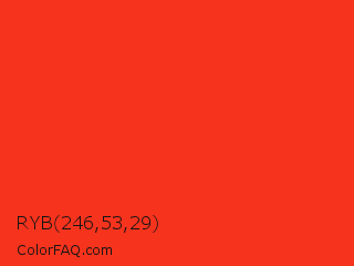 RYB 246,53,29 Color is a normal red color and the nearest color is Red RYB #fe2712. Hex code #f6331d and RGB value is rgb(246,51,29). In RGB color space, this color is composed of 96% red, 20% green, 11% blue, In CMYK color space, this color is composed of 0% cyan, 79% magenta, 88% yellow , 4% black , In HSL color space, this color has a hue angle of 6° , 92% saturation and 54% lightness.