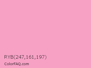 RYB 247,161,197 Color is a light rose color and the nearest color is Illusion #f6a4c9. Hex code #f7a1c5 and RGB value is rgb(247,161,197). In RGB color space, this color is composed of 97% red, 63% green, 77% blue, In CMYK color space, this color is composed of 0% cyan, 35% magenta, 20% yellow , 3% black , In HSL color space, this color has a hue angle of 335° , 84% saturation and 80% lightness.