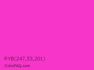 RYB 247,53,201 Color is a normal magenta color and the nearest color is Razzle Dazzle Rose #ff33cc. Hex code #f735c9 and RGB value is rgb(247,53,201). In RGB color space, this color is composed of 97% red, 21% green, 79% blue, In CMYK color space, this color is composed of 0% cyan, 79% magenta, 19% yellow , 3% black , In HSL color space, this color has a hue angle of 314° , 92% saturation and 59% lightness.