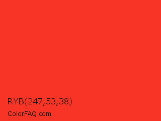RYB 247,53,38 Color is a normal red color and the nearest color is Red Orange #ff3f34. Hex code #f73426 and RGB value is rgb(247,52,38). In RGB color space, this color is composed of 97% red, 20% green, 15% blue, In CMYK color space, this color is composed of 0% cyan, 79% magenta, 85% yellow , 3% black , In HSL color space, this color has a hue angle of 4° , 93% saturation and 56% lightness.