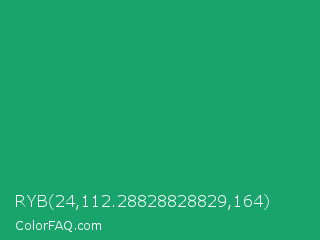 RYB 24,112.28828828829,164 Color is a normal green color and the nearest color is Green Crayola #1cac78. Hex code #18a46a and RGB value is rgb(24,164,106). In RGB color space, this color is composed of 9% red, 64% green, 42% blue, In CMYK color space, this color is composed of 85% cyan, 0% magenta, 35% yellow , 36% black , In HSL color space, this color has a hue angle of 155° , 74% saturation and 37% lightness.