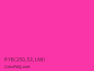 RYB 250,53,168 Color is a normal magenta color and the nearest color is Persian Rose #fe28a2. Hex code #fa35a8 and RGB value is rgb(250,53,168). In RGB color space, this color is composed of 98% red, 21% green, 66% blue, In CMYK color space, this color is composed of 0% cyan, 79% magenta, 33% yellow , 2% black , In HSL color space, this color has a hue angle of 325° , 95% saturation and 59% lightness.