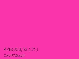 RYB 250,53,171 Color is a normal magenta color and the nearest color is Persian Rose #fe28a2. Hex code #fa35ab and RGB value is rgb(250,53,171). In RGB color space, this color is composed of 98% red, 21% green, 67% blue, In CMYK color space, this color is composed of 0% cyan, 79% magenta, 32% yellow , 2% black , In HSL color space, this color has a hue angle of 324° , 95% saturation and 59% lightness.