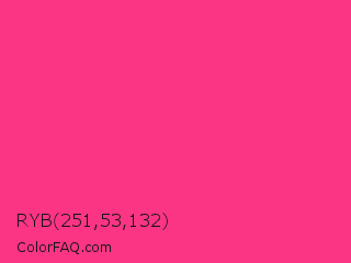 RYB 251,53,132 Color is a normal rose color and the nearest color is Cerise Pink #ec3b83. Hex code #fb3584 and RGB value is rgb(251,53,132). In RGB color space, this color is composed of 98% red, 21% green, 52% blue, In CMYK color space, this color is composed of 0% cyan, 79% magenta, 47% yellow , 2% black , In HSL color space, this color has a hue angle of 336° , 96% saturation and 60% lightness.