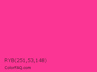 RYB 251,53,148 Color is a normal rose color and the nearest color is Wild Strawberry Crayola #ff3399. Hex code #fb3594 and RGB value is rgb(251,53,148). In RGB color space, this color is composed of 98% red, 21% green, 58% blue, In CMYK color space, this color is composed of 0% cyan, 79% magenta, 41% yellow , 2% black , In HSL color space, this color has a hue angle of 331° , 96% saturation and 60% lightness.
