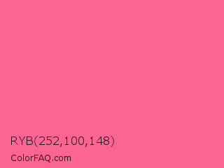 RYB 252,100,148 Color is a light rose color and the nearest color is Light Crimson #f56991. Hex code #fc6494 and RGB value is rgb(252,100,148). In RGB color space, this color is composed of 99% red, 39% green, 58% blue, In CMYK color space, this color is composed of 0% cyan, 60% magenta, 41% yellow , 1% black , In HSL color space, this color has a hue angle of 341° , 96% saturation and 69% lightness.