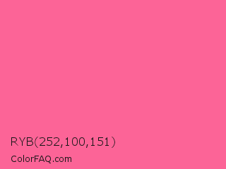 RYB 252,100,151 Color is a light rose color and the nearest color is Light Crimson #f56991. Hex code #fc6497 and RGB value is rgb(252,100,151). In RGB color space, this color is composed of 99% red, 39% green, 59% blue, In CMYK color space, this color is composed of 0% cyan, 60% magenta, 40% yellow , 1% black , In HSL color space, this color has a hue angle of 340° , 96% saturation and 69% lightness.