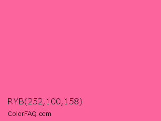 RYB 252,100,158 Color is a light rose color and the nearest color is French Pink #fd6c9e. Hex code #fc649e and RGB value is rgb(252,100,158). In RGB color space, this color is composed of 99% red, 39% green, 62% blue, In CMYK color space, this color is composed of 0% cyan, 60% magenta, 37% yellow , 1% black , In HSL color space, this color has a hue angle of 337° , 96% saturation and 69% lightness.