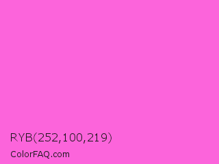 RYB 252,100,219 Color is a light magenta color and the nearest color is Rose Pink #ff66cc. Hex code #fc64db and RGB value is rgb(252,100,219). In RGB color space, this color is composed of 99% red, 39% green, 86% blue, In CMYK color space, this color is composed of 0% cyan, 60% magenta, 13% yellow , 1% black , In HSL color space, this color has a hue angle of 313° , 96% saturation and 69% lightness.