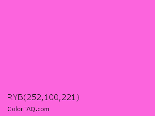 RYB 252,100,221 Color is a light magenta color and the nearest color is Rose Pink #ff66cc. Hex code #fc64dd and RGB value is rgb(252,100,221). In RGB color space, this color is composed of 99% red, 39% green, 87% blue, In CMYK color space, this color is composed of 0% cyan, 60% magenta, 12% yellow , 1% black , In HSL color space, this color has a hue angle of 312° , 96% saturation and 69% lightness.