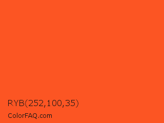 RYB 252,100,35 Color is a normal red color and the nearest color is Giants Orange #fe5a1d. Hex code #fc5523 and RGB value is rgb(252,85,35). In RGB color space, this color is composed of 99% red, 33% green, 14% blue, In CMYK color space, this color is composed of 0% cyan, 66% magenta, 86% yellow , 1% black , In HSL color space, this color has a hue angle of 14° , 97% saturation and 56% lightness.