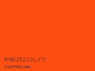 RYB 252,101,17 Color is a normal orange color and the nearest color is Orioles Orange #fb4f14. Hex code #fc4f11 and RGB value is rgb(252,79,17). In RGB color space, this color is composed of 99% red, 31% green, 7% blue, In CMYK color space, this color is composed of 0% cyan, 69% magenta, 93% yellow , 1% black , In HSL color space, this color has a hue angle of 16° , 98% saturation and 53% lightness.