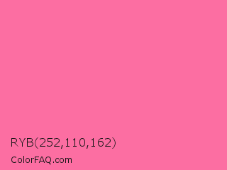 RYB 252,110,162 Color is a light rose color and the nearest color is French Pink #fd6c9e. Hex code #fc6ea2 and RGB value is rgb(252,110,162). In RGB color space, this color is composed of 99% red, 43% green, 64% blue, In CMYK color space, this color is composed of 0% cyan, 56% magenta, 36% yellow , 1% black , In HSL color space, this color has a hue angle of 338° , 96% saturation and 71% lightness.